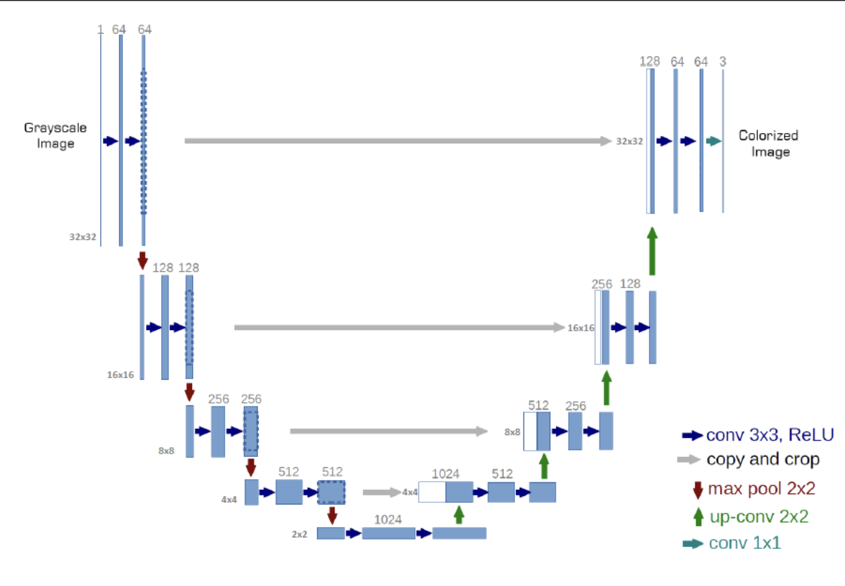 In the context of colorization, the U-Net acts as an autoencoder, compressesing the grayscale input and reconstructing a 3-channel RGB output.
