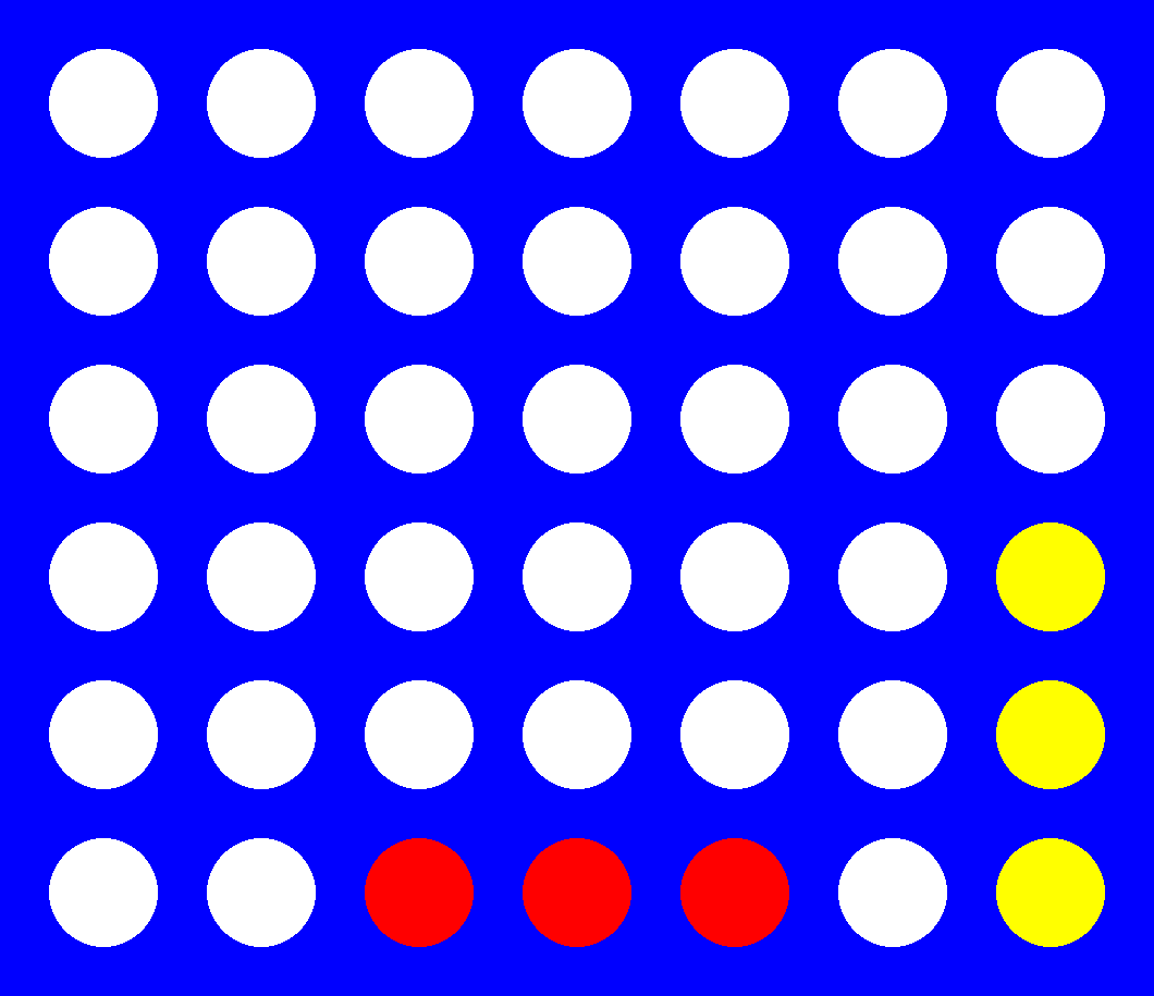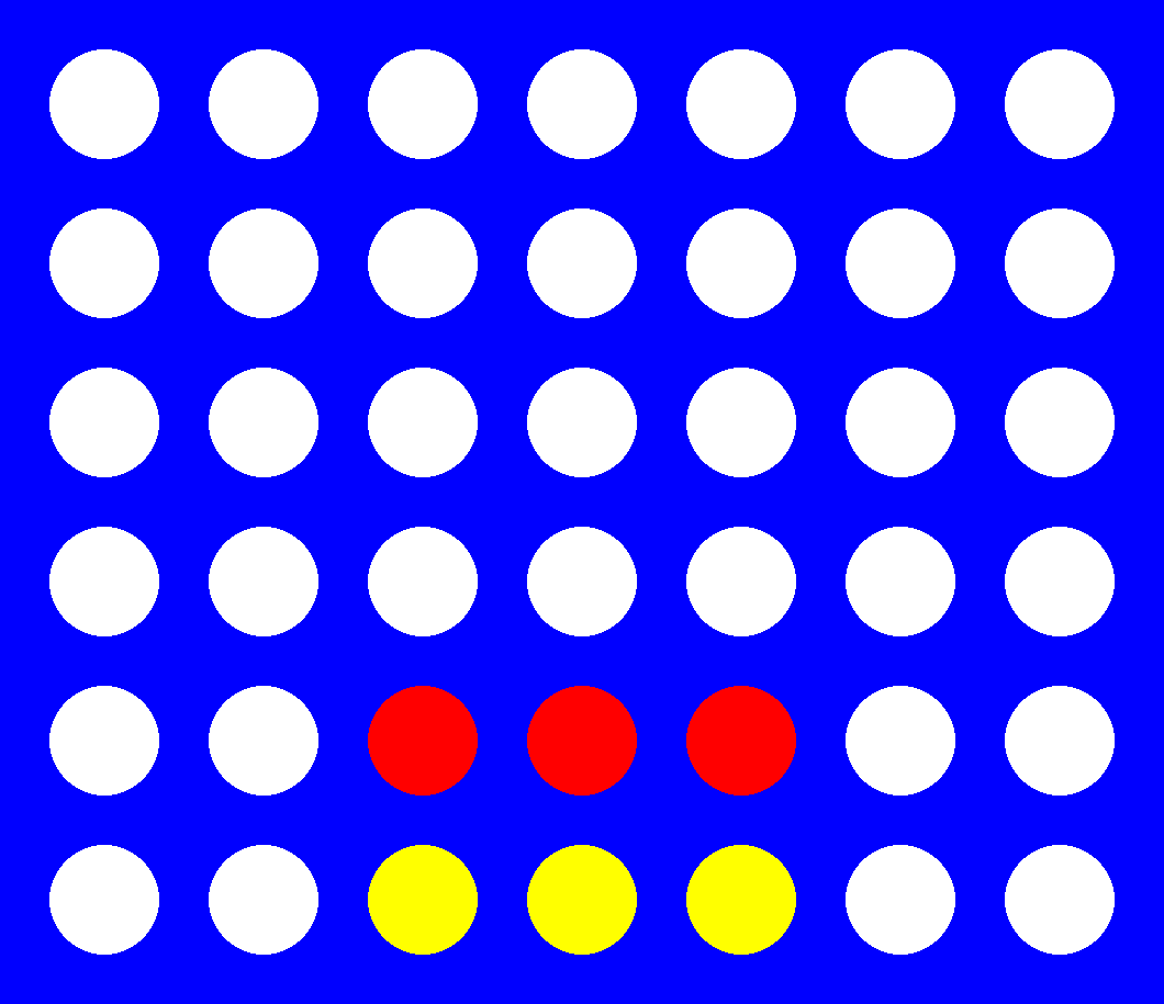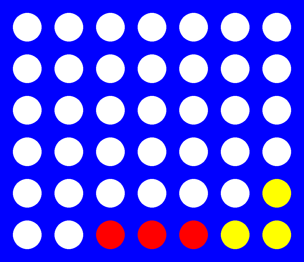 For simplicity, the figure below will be used to explain the subcases of feature 2 in a game with board dimensions [6, 7] and $X=4$. Assuming that red is $max$, $E(max)$ would yield infinity for the leftmost state, since a win is unstoppable at that point (2.1). The middle left state would result in 90k, as it represents an immediate advantage/threat (2.2). On the other hand, both the middle-right and right-most boards would yield 0, as the former cannot lead to a win, and the latter does not have any immediately available moves on either side (2.3). This is done to ensure that the $E$ does not overestimate a state’s utility.