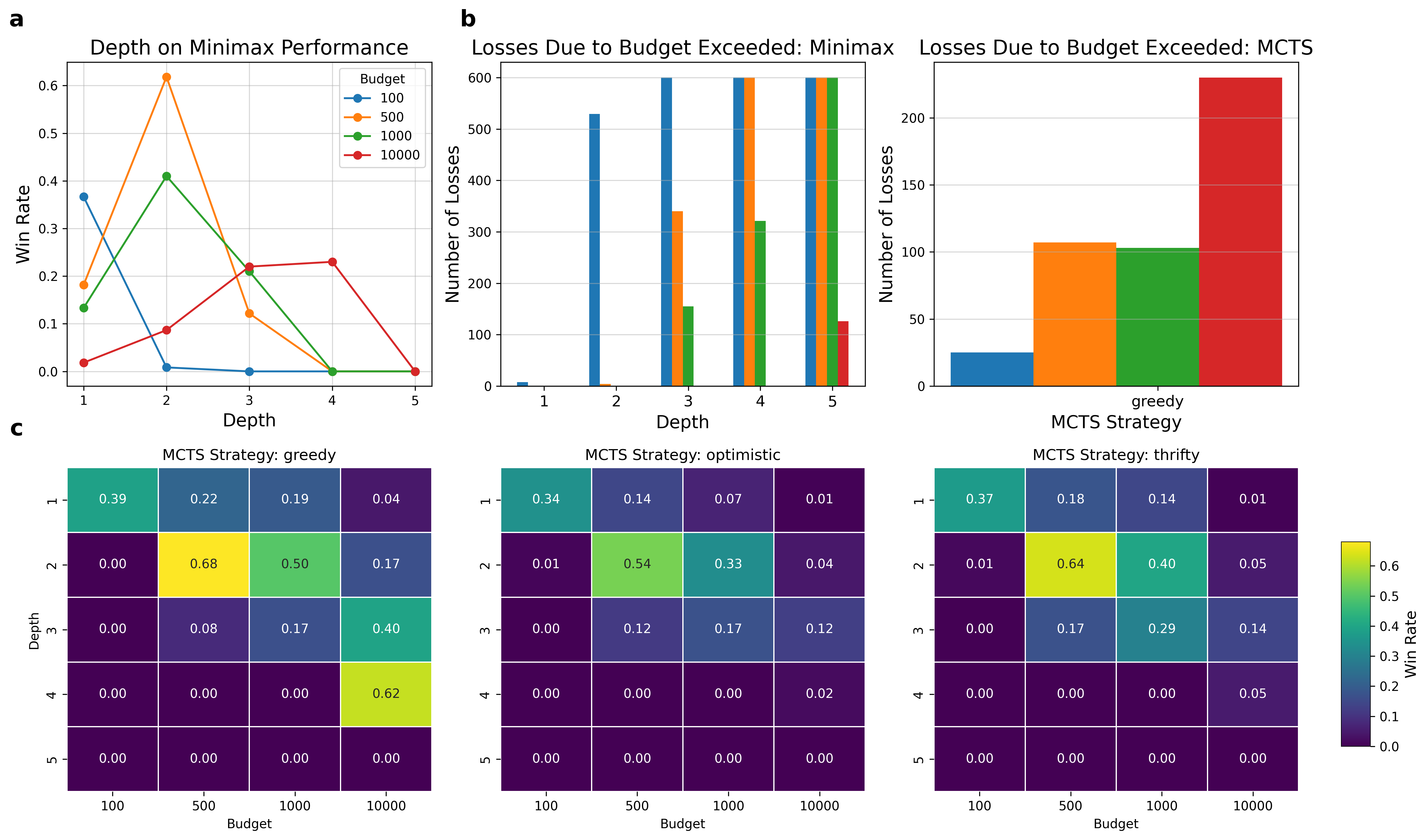 a, b, c, Analysis of game results. a, Line plot of the effect of Minimax's depth on its (adjusted) win rate across multiple budgets. b, Bar plots of number of losses due to forfeit/budget depletion across multiple budgets. Color scheme follows that of a. Left: Comparison of Minimax depths. Right: Greedy MCTS. c, Heatmaps of Minimax's win rate across multiple depths, budgets and MCTS strategies. Each map represents a strategy. Color scheme maps win rate.