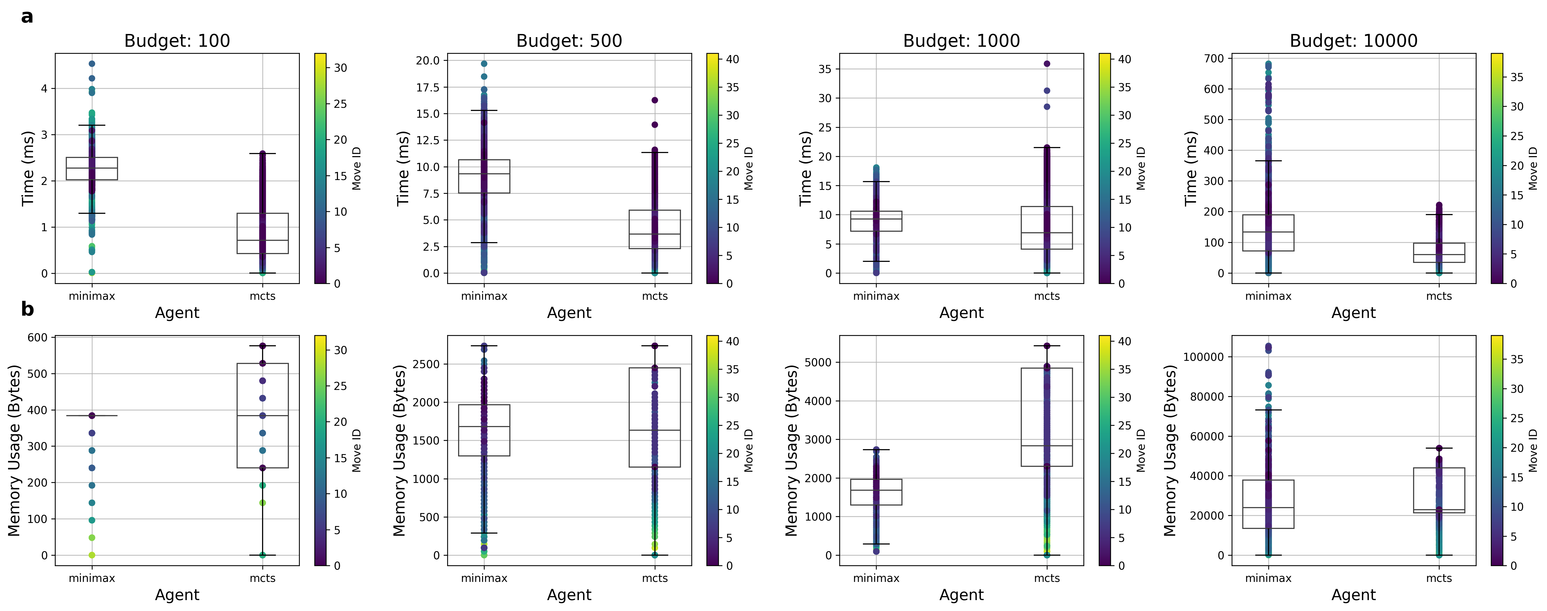 a, b, Visualization of result-agnostic performance metrics. Only Minimax's best depth at each budget. Color scheme represents the timing of each move, indicating how early or late in the game it was performed. a, Box plot visualization of time (ms) taken to pick a move across all budgets. b, Box plot visualization of approximation of memory (bytes) consumed at each move. Calculated as $mean(Minimax Node (bytes) \div MCTS Node (bytes))$.