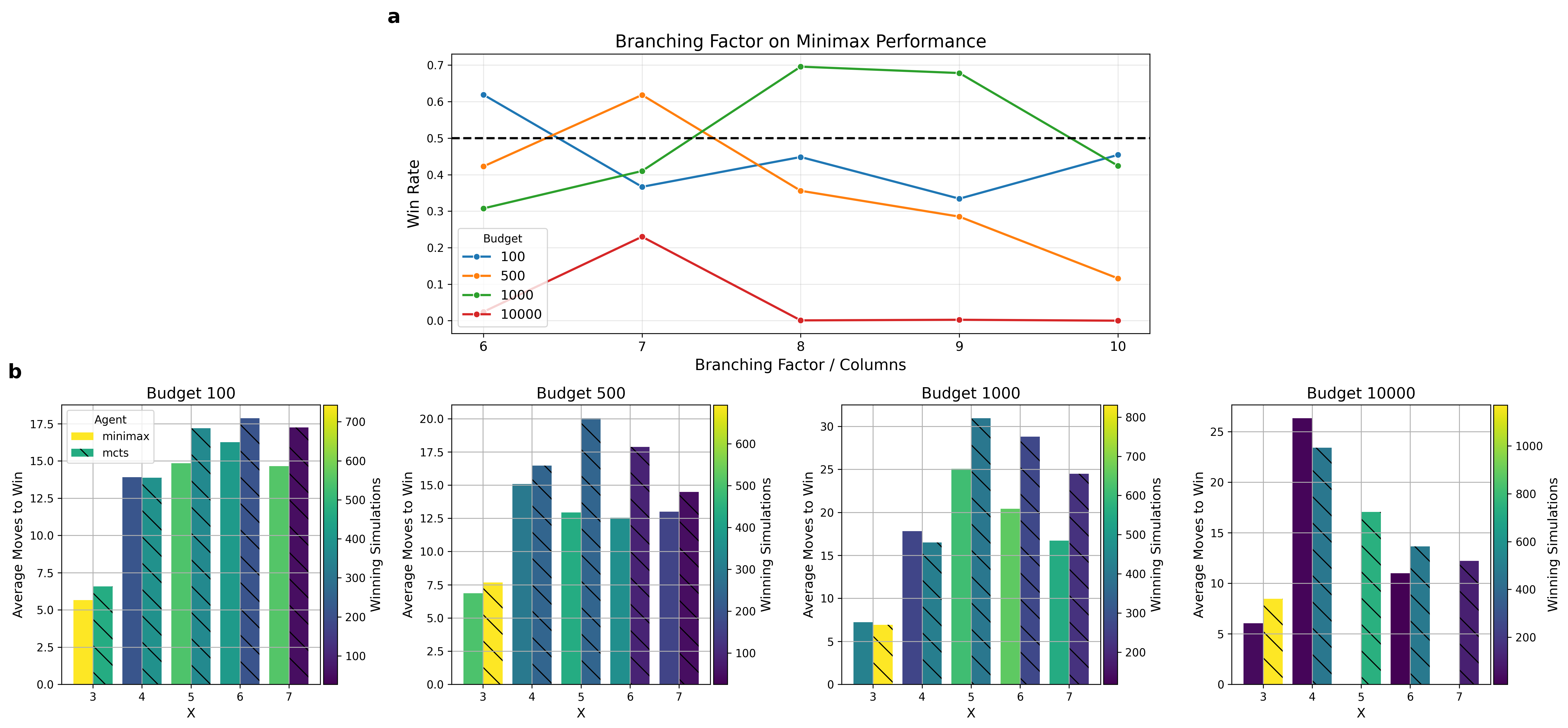 a, b, Simulations extended to variable board/rule configurations. Again, Minimax's depths at each budget were chosen according to the previous analysis. a, Line plot visualization of the effect of the game's branching factor (board's number of columns) on Minimax's win rate across multiple budgets. The dashed line marks the 50% win rate, with every point above it indicating performance superior to that of MCTS. b, Bar plots showcasing the average number of moves played to reach a win across X values. Every plot represents a budget, the color scale indicates the number of simulations used to compute the average, and the hatch indicates the agent.