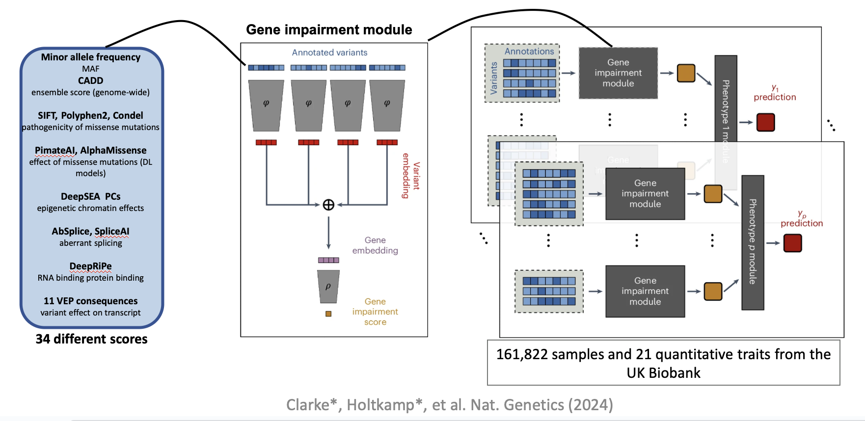 DeepRVAT integrates variant annotations using deep set networks to boost rare variant association testing. The pre-trained DeepRVAT model can be used to compute gene impairment scores for new genes and samples.